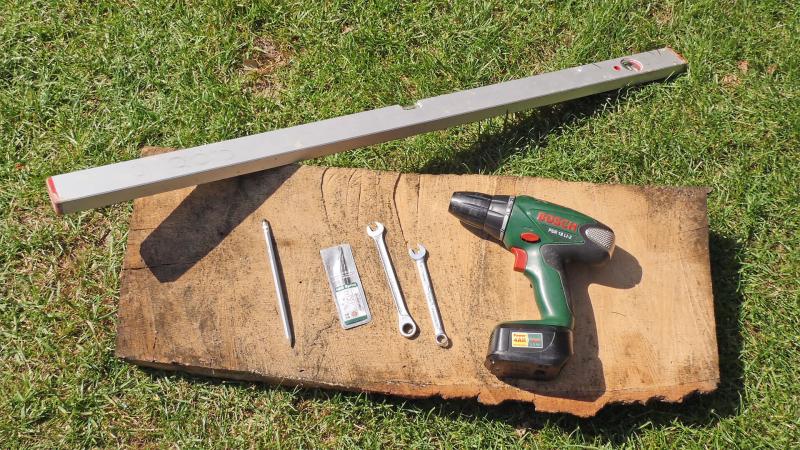Pour le montage, vous aurez besoin d'une perceuse avec un foret à métal de 4,2mm ainsi qu'un tournevis cruciforme (PH2). Vous aurez également besoin d'un niveau à bulle, d'un mètre mesureur, d'un crayon et de deux clés plates 10. Pour ce type de montage vous aurez également besoin d'une perceuse à percussion et des chevilles et vis adaptées à la maçonnerie.