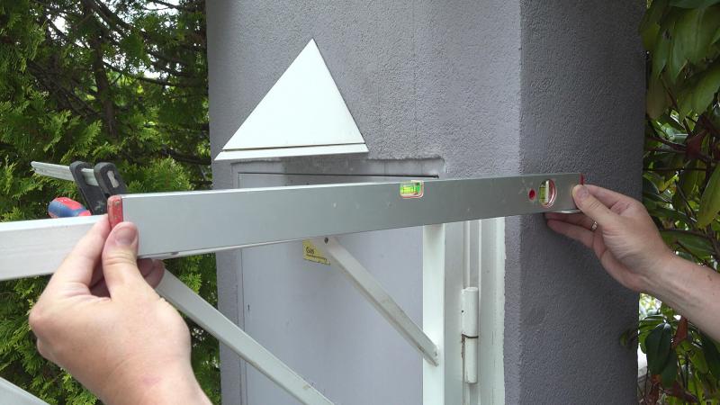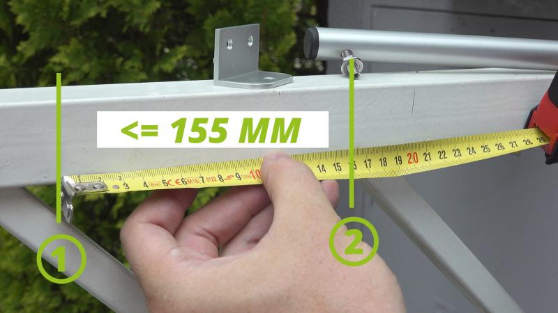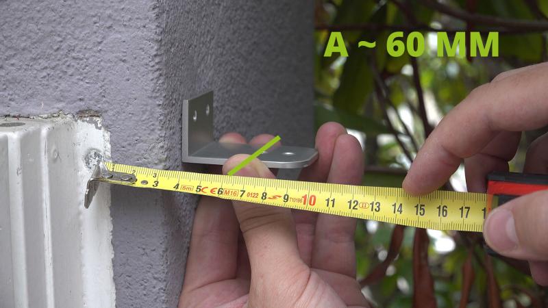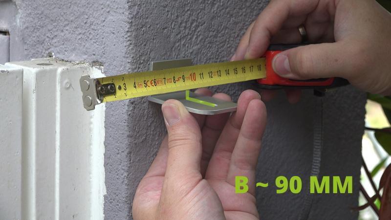 Après avoir défini la position de montage, on vérifie l'écart entre le point d'articulation du portail (le point central de la charnière) et le point d'articulation du ferme-portail (le trou de montage choisi sur l’équerre 1). Pour cela on a besoin de l'équerre la plus longue (équerre 1).