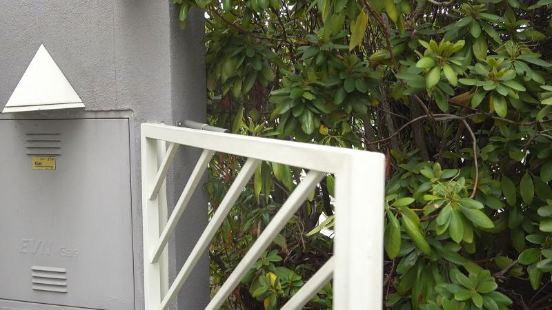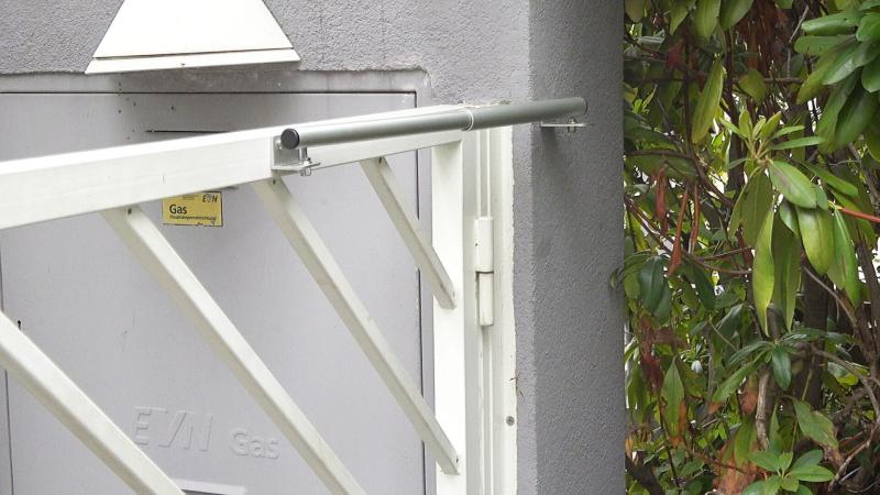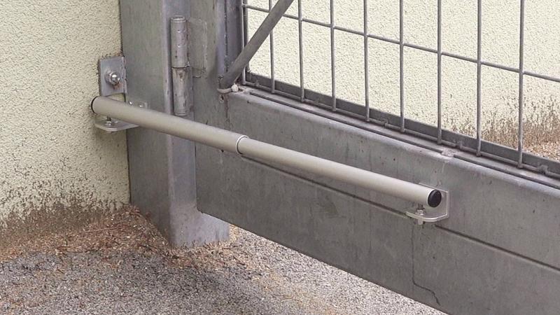 Cet exemple montre un montage spécial de la variante 2, c'est à dire le montage sur un portail avec des charnières latérales. Ce montage est spécial, car dans ce cas l'équerre 1, qui est fixée du côté de la charnière du portail, ne sera pas fixée sur le poteau mais sur le mur adjacent. Dans notre cas une équerre de 60mm de long (équerre 1) est suffisante. Une équerre 1 plus longue peut être nécessaire pour les autres variantes. Toutes les équerres disponibles sont dans la catégorie accessoires.