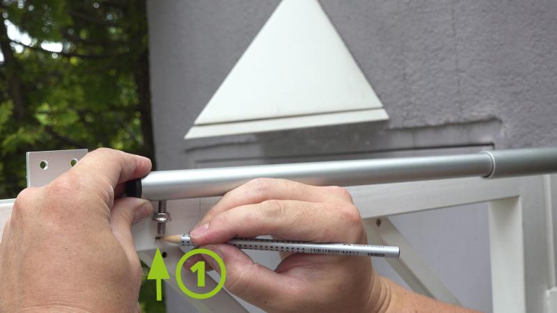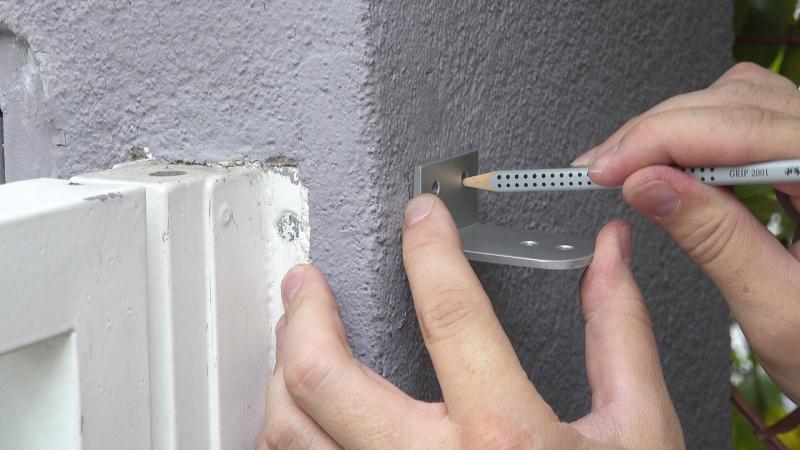 Après avoir déterminé la position de montage de l'équerre 1 sur le poteau, on marque de manière lisible les trous de perçage avec un crayon. Les trous de perçage sont réalisés à l'aide d'une perceuse à percussion et d'un foret à maçonnerie/béton de 6 ou 8 mm d'épaisseur. Une fois les trous fait, il faut les nettoyer de la poussière de perçage.