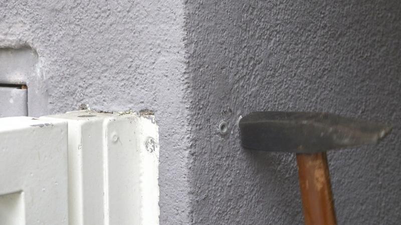 Des chevilles adaptées à la maçonnerie sont insérées dans les trous de forage. Remarque : En raison du grand nombre de types de maçonnerie différents, ces chevilles ne sont pas inclus avec le ferme-portail de jardin.