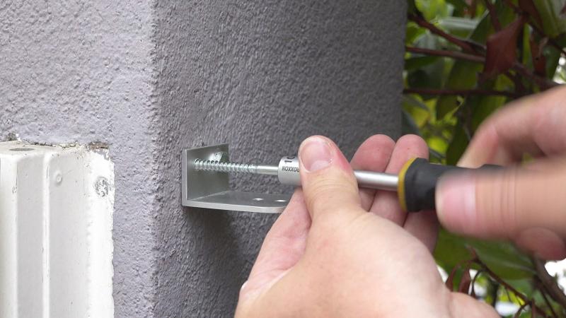 Après avoir inséré les chevilles, on fixe l'équerre avec des vis appropriées. Les vis doivent toujours être 10 mm plus longues que les chevilles pour assurer une prise sûre.