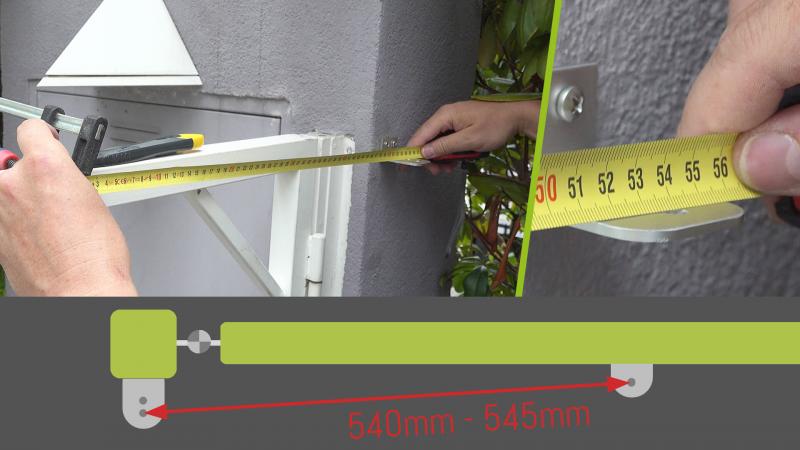 Une fois que l'équerre 1 est dans la bonne position, la plus grande partie du travail est déjà faite. Il faut maintenant déterminer la position du ferme-portail sur le portail (équerre 2). Pour cela, il faut mesurer l'écart de trou à trou de 540 jusqu'à maximum 545 mm. Cela signifie que le trou de de l'équerre dans lequel le ferme-portail sera monté doit être à 540 mm du trou de montage choisi sur l'équerre 1.