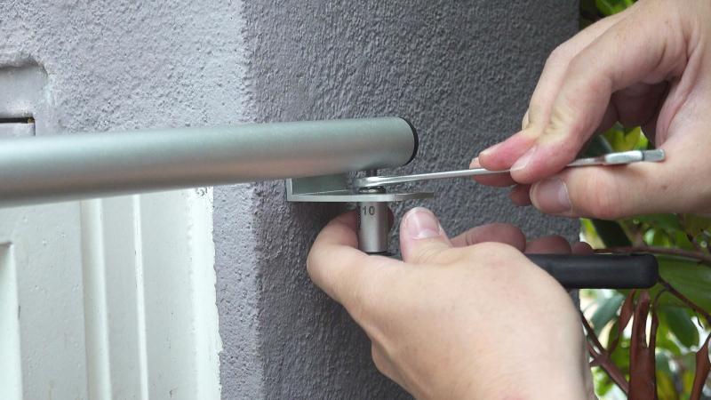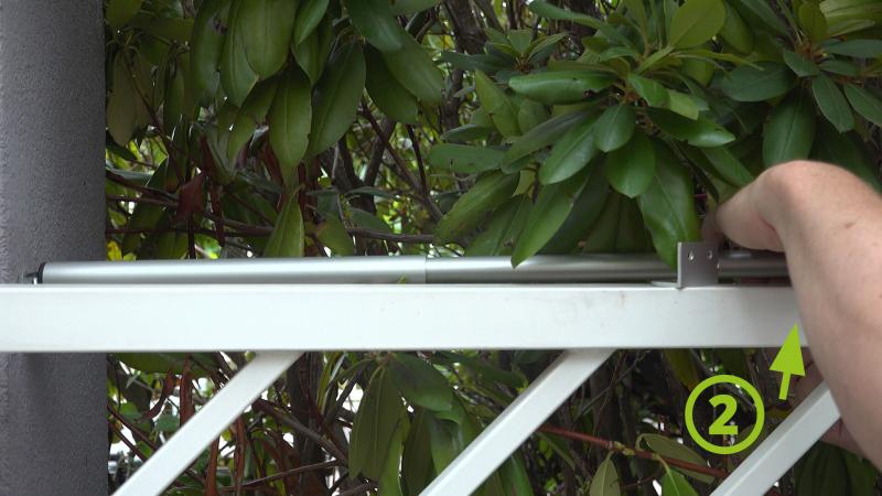 Pour installer le ferme-portail, il faut suffisamment ouvrir le portail pour que le ferme-portail puisse être inséré dans les trous des équerres facilement. Le côté le plus large du ferme-portail est fixé sur l'équerre 1 (équerre sur le mur). Le côté fin est fixé sur l'équerre de montage 2 (sur le portail).