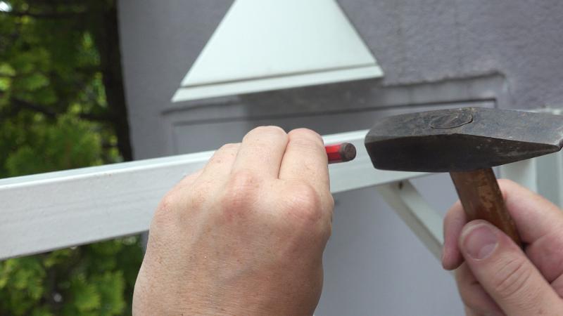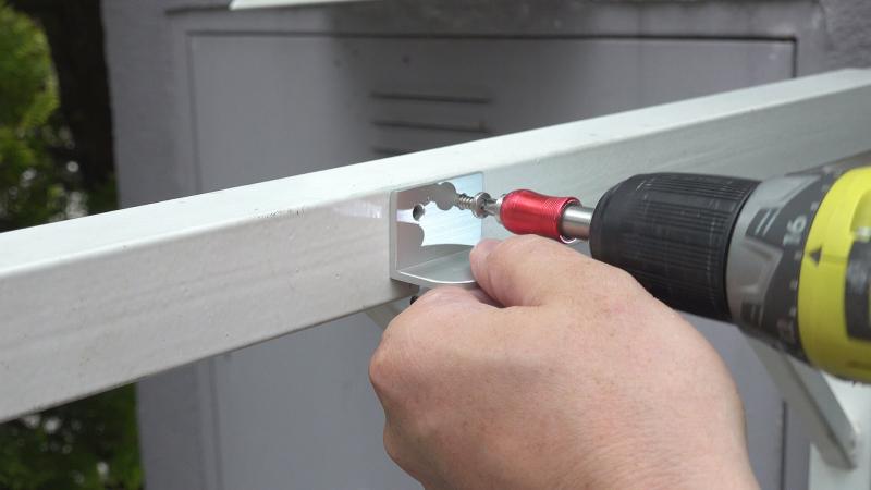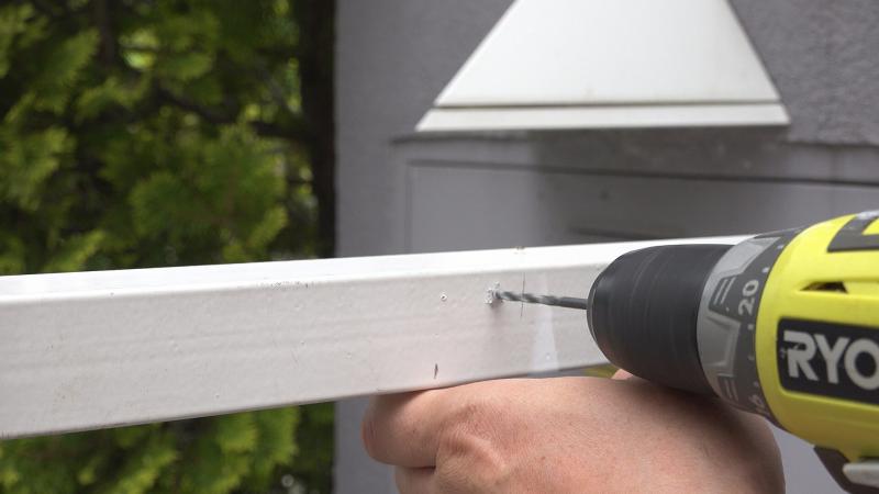 On peut maintenant marquer au crayon les deux trous de la deuxième équerre et marquer l'empreinte au pointeau et percer avec le foret à métal de 4,2 mm. La taille du foret est très importante car si le diamètre du trou est trop petit, la vis peut se casser. Si le diamètre est trop grand, la vis ne trouvera pas de prise. Léquerre est fixée avec les vis en acier inoxydable fournies.