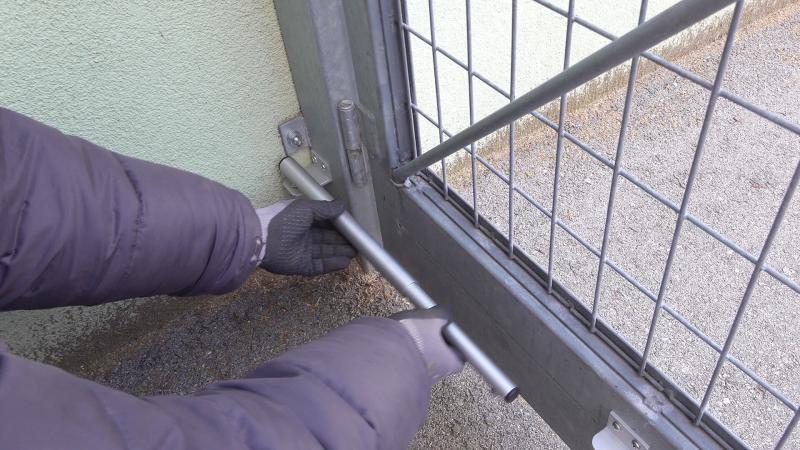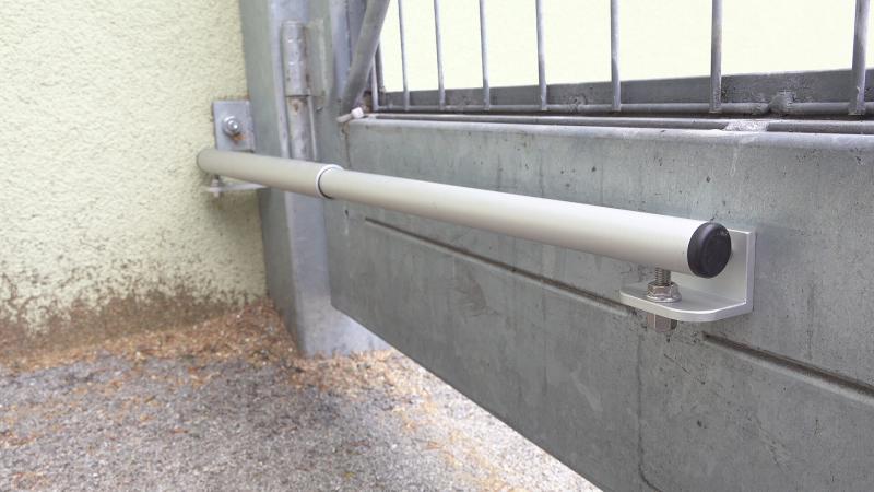 Il ne reste plus qu'à installer le ferme-portail. Pour l'installer, il faut suffisamment ouvrir le portail pour que le ferme-portail puisse être inséré dans les trous des équerres facilement. Le côté le plus large du ferme-portail est fixé sur l'équerre 1 (équerre sur le poteau). Le côté fin est fixé sur l'équerre de montage 2 (sur le portail).