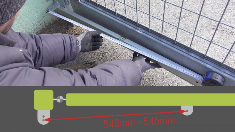 Une fois que l'équerre 1 est dans la bonne position, la plus grande partie du travail est déjà faite. Il faut maintenant déterminer la position du ferme-portail sur le portail. Pour cela, il faut mesurer l'écart de trou à trou de 540 jusqu'à maximum 545 mm. Cela signifie que le trou de perçage sur le portail doit être à 540 mm du trou de montage choisi sur l'équerre 1.