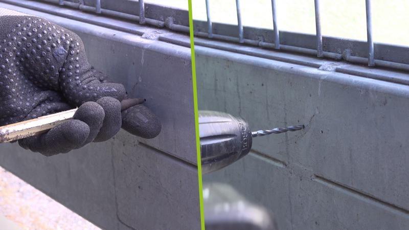 Après avoir déterminé la position de montage de l'équerre 1 sur le poteau, on marque de manière lisible les trous de perçage avec un crayon. On marque ensuite l'empreinte au pointeau pour empêcher le foret à métal de glisser.