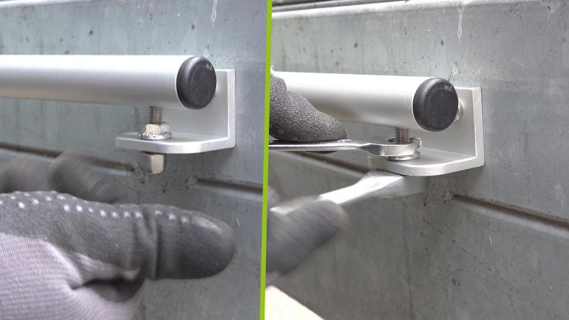 Pour finir, les deux écrous borgnes sont vissés et le ferme-portail est fixé avec les contre-écrous. Les écrous doivent être suffisamment serrés pour que les tiges filetées soint redressées et perpendiculaires au support de montage.