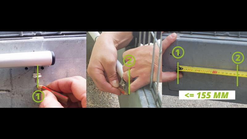 ATTENTION: Si on change la position de l'équerre 1 (sur le poteau) ultérieurement, il faut absolument mesurer à nouveau l'écart trou à trou et modifier également la position du trou sur le portail. Il est très important de commencer par définir la position de la première équerre avant de percer le trou dans le portail.