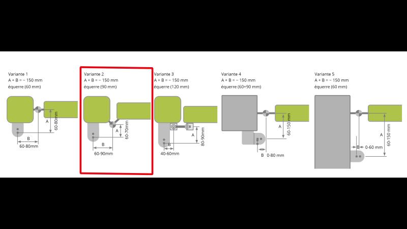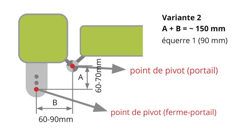 La somme des deux longueurs A et B ne doit pas dépasser 150 mm dans cette variante, elle ne doit pas non plus être plus petite que 140 mm. Si la somme des deux longueurs est plus grande que 150 mm, il se peut que le portail ne puisse plus être ouvert qu'à moins de 90°.