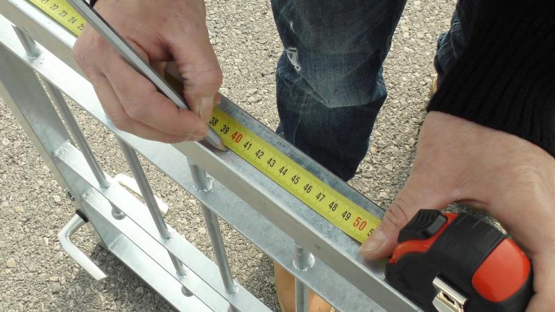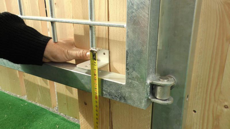 Après avoir défini la position de montage, on vérifie l'écart entre le point d'articulation du portail (le point central de la charnière) et le point d'articulation du ferme-portail. Pour cela on a besoin de l'équerre la plus longue (équerre 1).