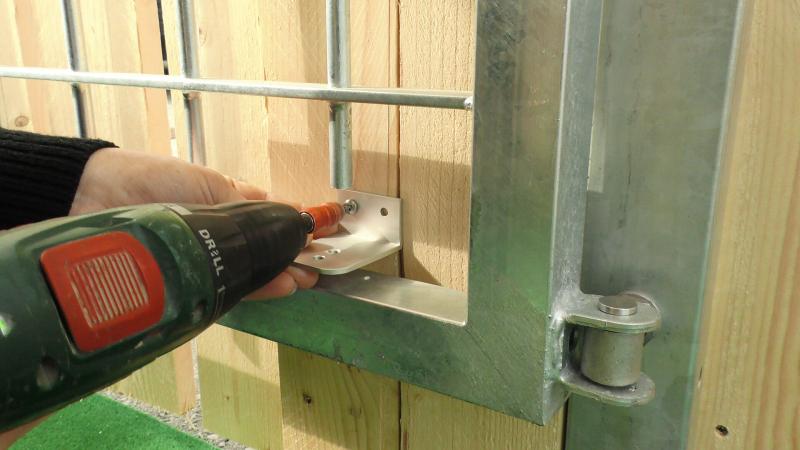 Après avoir remonté le portail, on peut insérer le ferme-portail. On commence par la partie la plus large du ferme-portail qu'on fixe sur l'équerre du côté du mur (équerre 1). La partie fine est insérée dans le trou qui vient d'être percé.