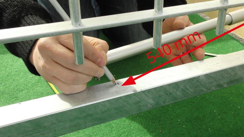 Une fois que l'équerre 1 est dans la bonne position, la plus grande partie du travail est déjà faite. Il faut maintenant déterminer la position du ferme-portail sur le portail. Pour cela, il faut mesurer l'écart de trou à trou de 540 jusqu'à maximum 545 mm. Cela signifie que le trou de perçage sur le portail doit être à 540 mm du trou de montage choisi sur l'équerre 1.