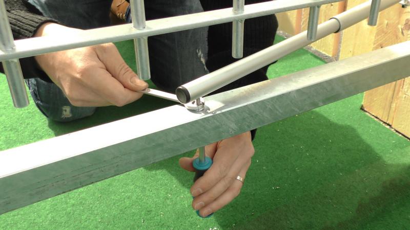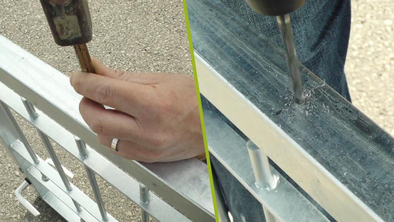 Une fois la position de perçage définie, on démonte le portail et on marque le repère de perçage sur le bas du portail. On peut maintenant complètement percer avec un foret à métal de 6mm. Le trou doit traverser le cadre. Le bas du portail est ensuite percé avec un foret étagé pour que l'on puisse y passer une clé allen de 10mm.