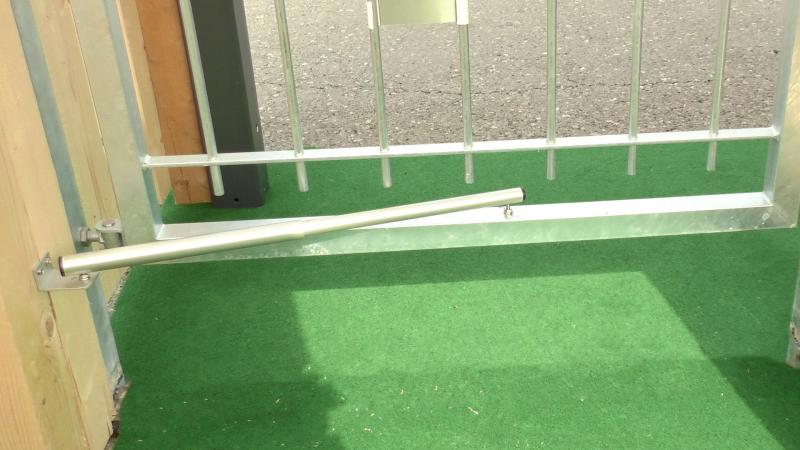 ATTENTION: Le ferme-portail est bloqué en position compressée. Par conséquent les tiges filetées ne sont pas droites. C'est tout fait normal. Les tiges se redresseront seules lors du montage. La sécurité du ferme-portail ne doit pas être enlevée avant que le ferme-portail ne soit monté.
